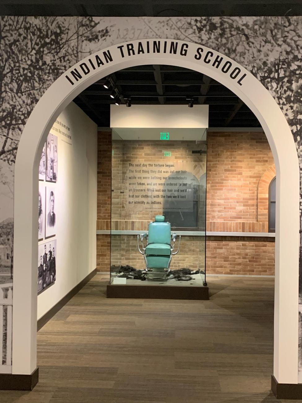 Later that afternoon, Chair Lowe visited the Heard Museum and toured the NEH-funded exhibition “Away From Home: American Indian Boarding School Stories,” which examines the forced assimilation of American Indians by the widespread removal of Native children from their homes and families to government-operated boarding schools—a process that began in the 1870s. This permanent exhibition features first-person interviews, immersive models of boarding school dormitories, touch-screen interactive virtual maps, and collections of clothing from generations of students who attended federally run boarding schools. A section on arrival at the schools includes a barber’s chair where new students had their hair—spiritually symbolic for many Native cultures—cut upon entry, accompanied by “before” and “after” photos of students in Native garb and school uniforms. The exhibition also describes the schools’ emphasis on vocational training, staff treatment of students’ homesickness, and the waves of illnesses, such as tuberculosis, that swept through the schools. Recent investigations by the Department of the Interior have found that between 1819 and 1969, 408 federal Indian boarding schools operated across the United States. In Arizona, the Phoenix Indian School was officially closed in 1990.