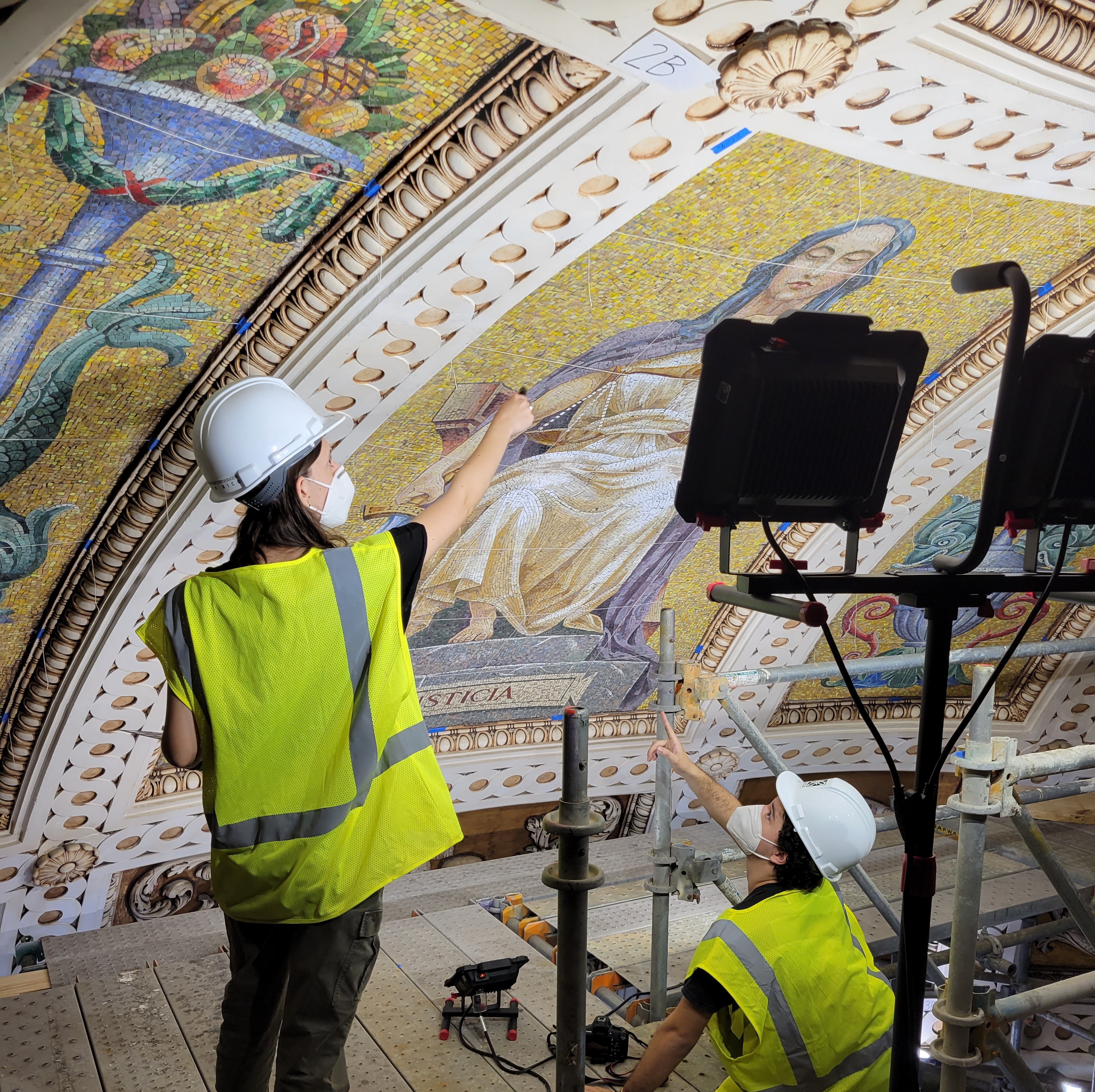 CENCOR Historic Buildings and Sites' staff developing a Conditions Assessment of the Interior Cupula at the Puerto Rico State Capitol in March 2022. The assessment included a detailed report on the conditions of Venetian mosaics, ornamental plasterwork, and stained glass elements.