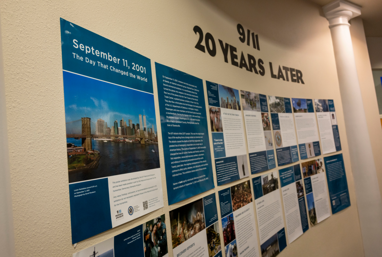 WASHINGTON, D.C. —Those old enough in 2001 to comprehend the shock and horror of the September 11 terrorist attacks can recall those events with crystalline clarity. Most can provide an almost hour-by-hour account of the day from the moment when the first hijacked plane hit the World Trade Center’s North Tower. But for those who were children or born after the September 11 attacks, the event and the era of mourning, fear, and political turmoil that followed are known only through the remove of history books, television programs, and conversations with relatives. As the twentieth anniversary of September 11 approaches, a National Endowment for the Humanities (NEH)-funded library exhibition program offers an opportunity for both those audiences to come together to remember the largest foreign attack on American soil, honor the victims, and reflect on its significance as a historical turning point.