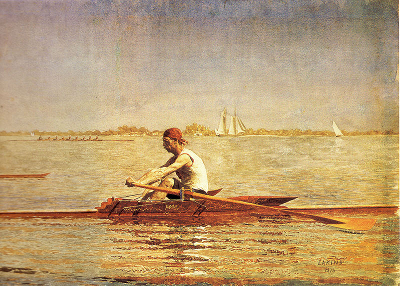 Eakins’ 1873 watercolor painting titled "John Biglin in a Single Scull" is a depiction of one of New York’s famous professional rowers as he races on the Schuylkill River in Philadelphia. It serves as an example of the sort of outdoor activity that was growing in popularity near the turn of the twentieth century as medical opinion increasingly encouraged exercise.