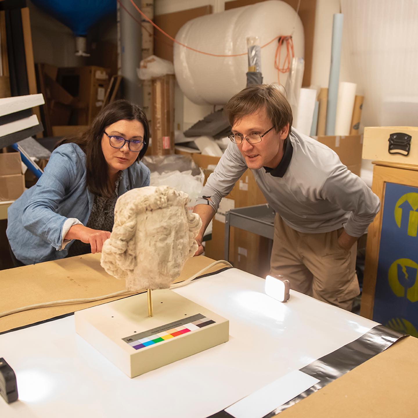 Dr. Jennifer Feltman, associate professor of medieval art and architecture, and Dr. Alexandre Tokovinine, associate professor of anthropology, documenting sculptures from Notre Dame at the Nasher Museum of Art, Duke University.